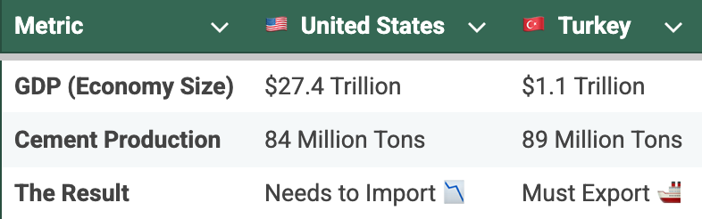 The Great Imbalance: To understand why this happens, look at the supply and demand imbalance. The US economy is huge ($27 trillion GDP), but Turkey’s economy is much smaller (around $1 trillion). Despite this, Turkey produces more cement than the entire United States.