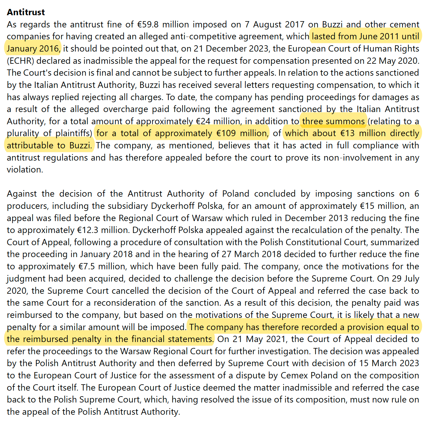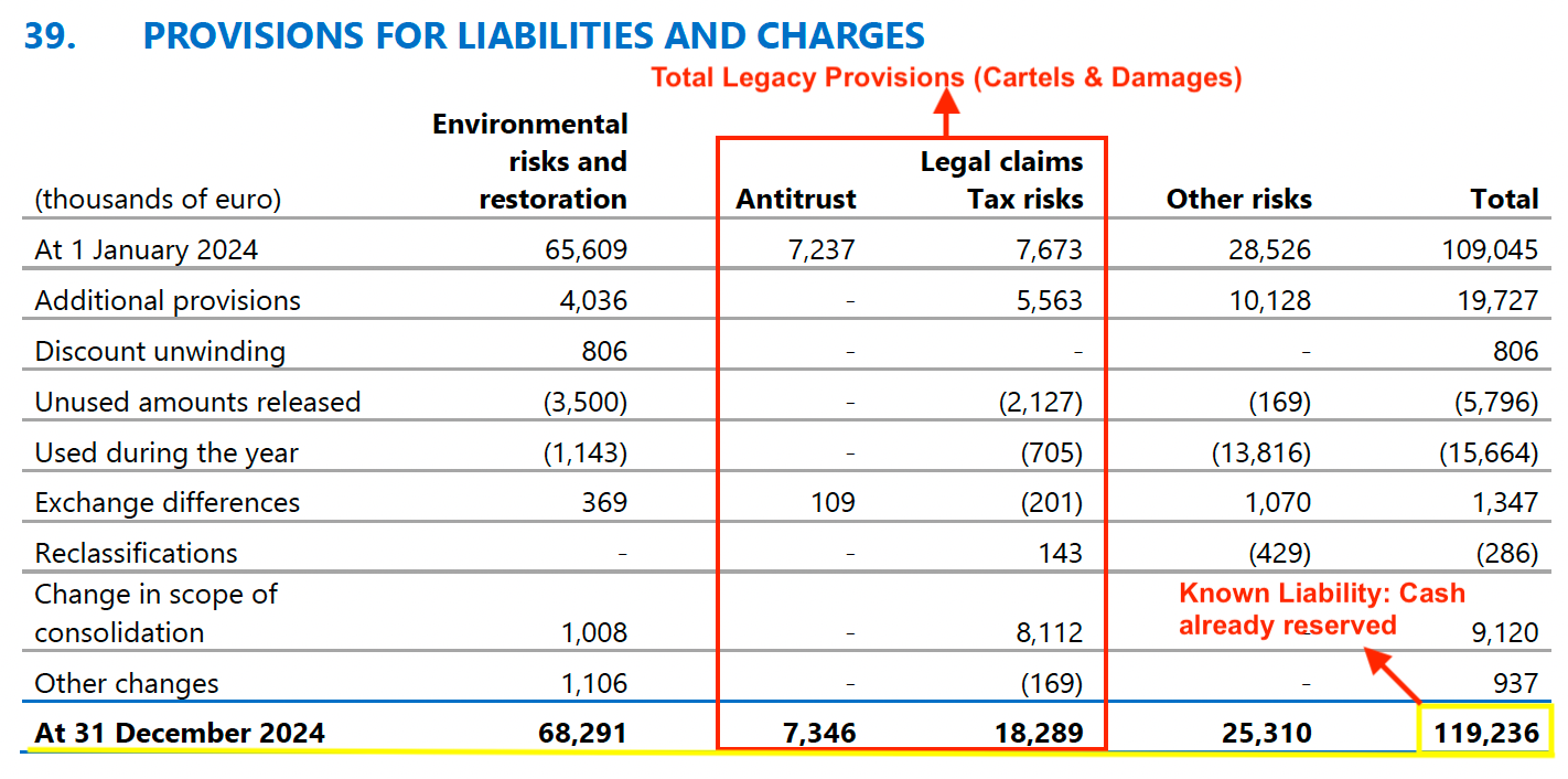 The Antitrust & Legal Claims: The headline number of "€109 million" in civil claims can look alarming, but it doesn’t break the thesis. In these lawsuits, plaintiffs always start with a maximum theoretical figure as a negotiation tactic. The report shows that the portion directly linked to Buzzi is actually closer to €13 million. Since the main fines regarding the 2011-2016 investigation were already paid, the remaining risk is covered by the provisions you see in the table.