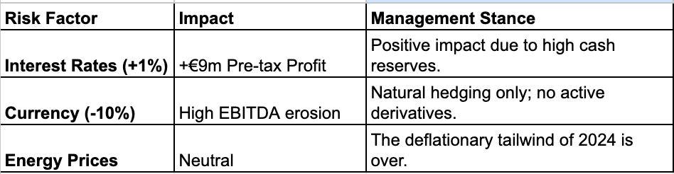 “Natural Hedge” Because Buzzi holds more cash than debt, the interest rate environment is effectively neutral for them. While the variable cost of their gross debt has risen (to 4.33%), they earn significantly higher interest income on the €1.1 billion sitting in their accounts. This setup acts as a natural hedge. If rates drop in 2026, their interest expense falls immediately. By staying liquid and variable, they are not trapped in expensive long-term paper.