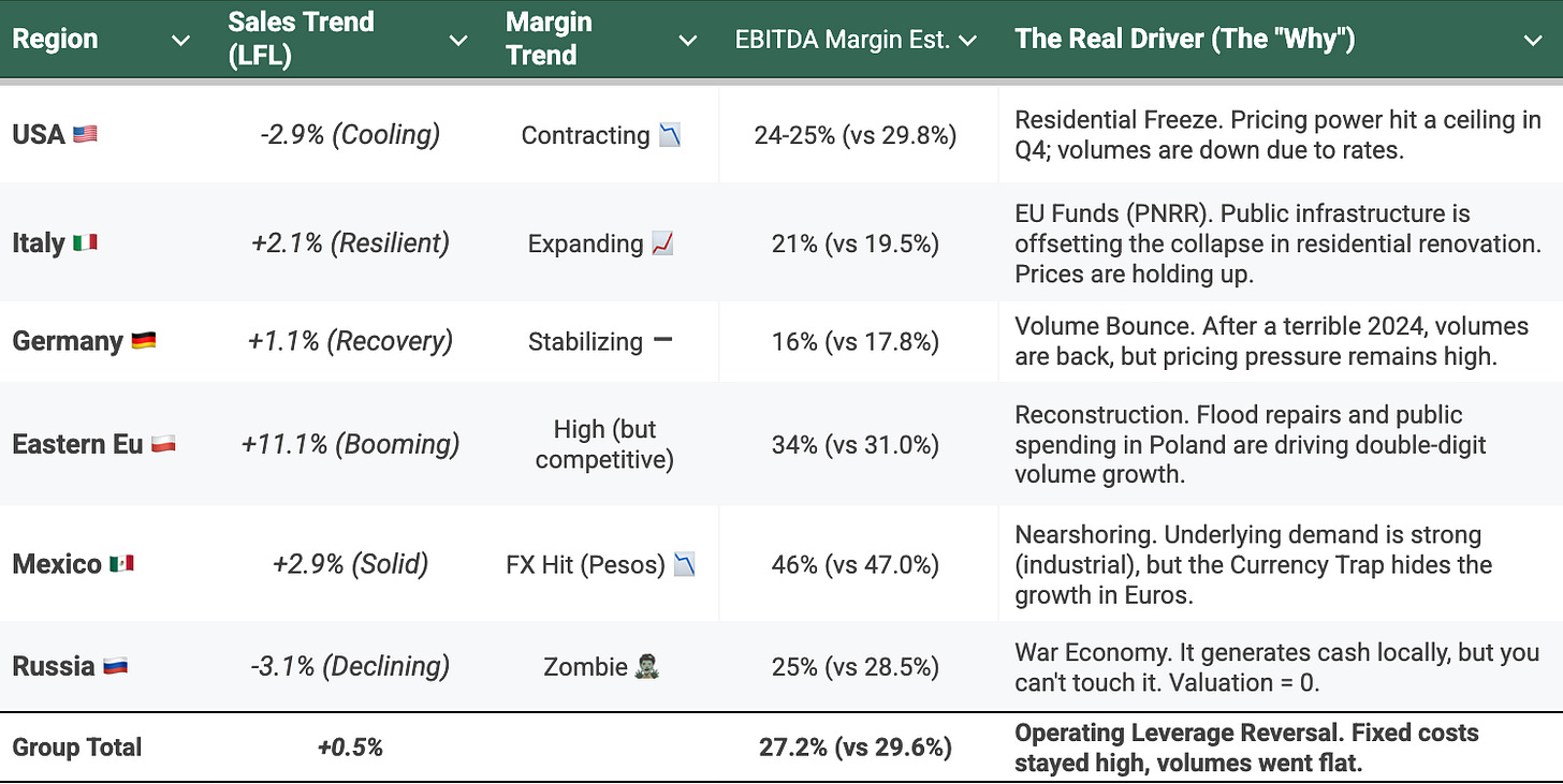 In 2024, the US was the margin king (30%). In 2025, the US margin collapsed to 25%, while Europe (Italy/Poland) expanded. The "Safety" of the group now relies on Europe holding the line while the US digests the high-interest rate cycle. The Group Margin erosion (240 basis points) is the price paid for the US slowdown.