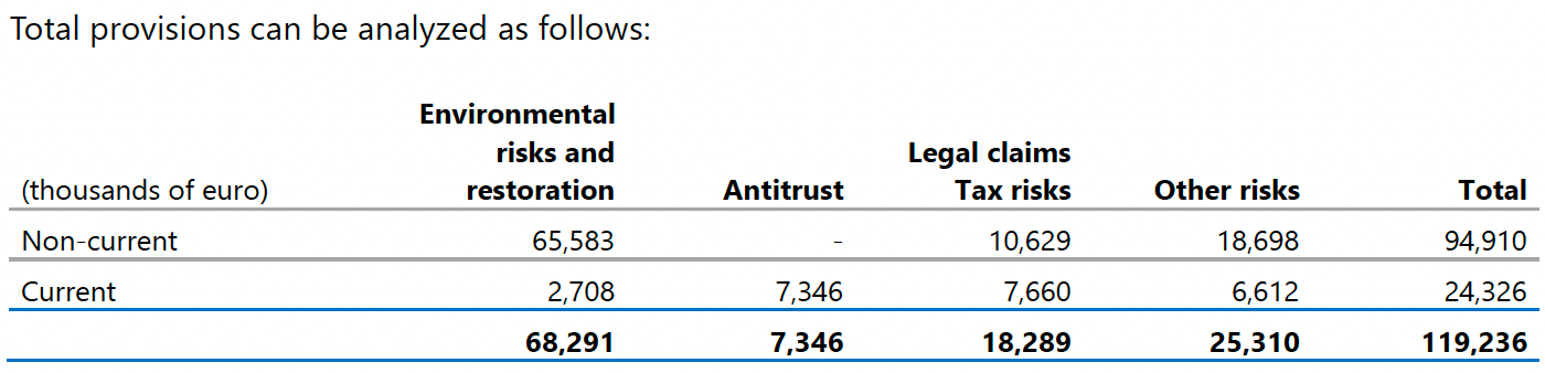 The Environmental Provision (€68.3M): This is the largest number in the table, but it is not a fine. As Buzzi owns the quarries, they have a legal obligation to restore the land when they finish extracting the rock. This is an Asset Retirement Obligation. If you look closely at the table, €65.6 million is classified as “Non-current”. This means Buzzi doesn’t have to pay this tomorrow. It is a technical debt that will be paid slowly over the next 10 or 20 years as quarries close. Regarding the specific legal issue in Augusta (Sicily), the courts have limited Buzzi’s liability, so the company only holds about €1.5 million for that specific case.