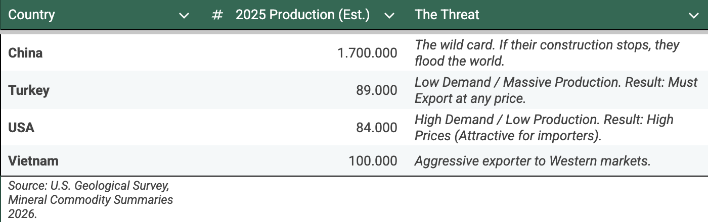 This creates a structural surplus. Turkey produces way more than it can consume. Since they can't store clinker forever, they are forced to export it to keep their kilns running. Naturally, they look for markets with high prices and strong currency. The US is the perfect target. This hurts Buzzi because if a Turkish ship arrives in Houston selling cement 20% cheaper (because they are desperate for volume and don't pay Carbon Taxes), Buzzi can't raise prices. The customer will just switch to the imported material.