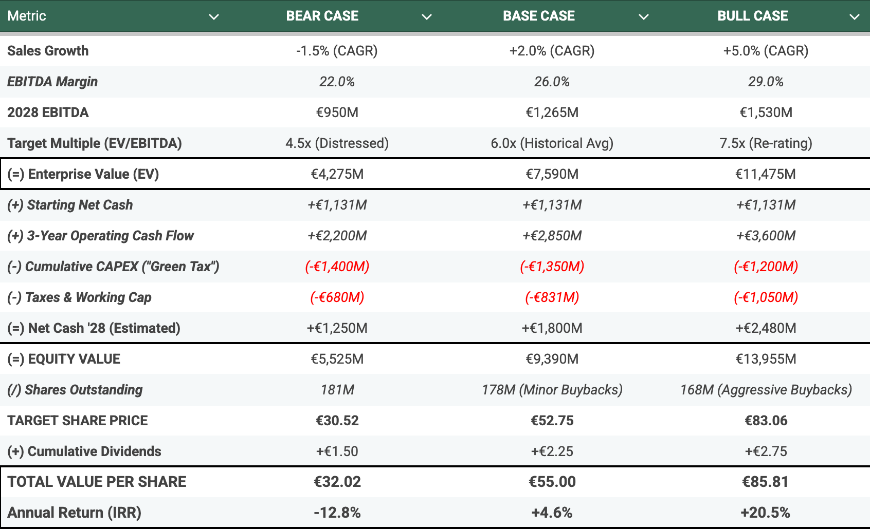 Bear Case Yes, I asume a hostile environment where everything goes wrong. We project a recession in residential construction (-1.5% sales), which hurts margins significantly due to operating leverage, dropping to 21.5%. But the critical part is the Capex. In this scenario, we assume decarbonization remains expensive, inflation persists, and no public subsidies arrive. Buzzi still has to pay the full €1.5B bill just to keep its license to operate. It’s a mandatory cost with no financial help. The market prices this distress at 4.5x EBITDA.